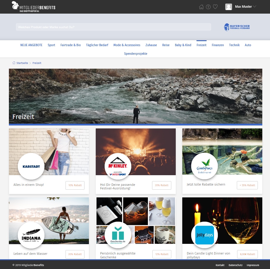 Der Bayerische Fußballverband e.V. profitiert von einem geschlossenen System, das im Corporate Design des Verbandes erstellt ist und allen BFV-Mitgliedern exklusiv Rabatte zur Verfügung stellt. Die Rabattangebote auf der Plattform sind speziell auf die Interessen der Mitglieder abgestimmt, inklusive der Einbindung vorhandener Partner und Sponsoren. Die vom Verband ausgewählten Anbieter sind Premiummarken, die den gesamten Haushaltswarenkorb umfassen und keine Wünsche offenlassen.