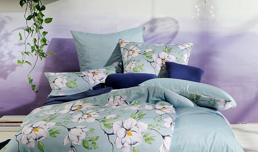 Die Kombination von Lila, hellen Blautönen, Gelb und Weiß strahlt Frische und Achtsamkeit aus. Eine Zusammenstellung, die bestens für das Schlafzimmer geeignet ist, wie bei der romantischen Mako-Satin-Bettwäsche mit üppig blühenden Magnolien. Wärme und Geborgenheit vermitteln hingegen Erd- und Naturfarben.