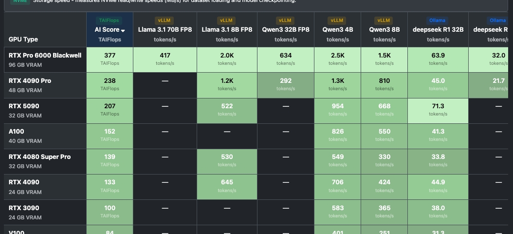 TAIFlops bewertet nicht nur die reine Rechenleistung, sondern auch die praktische Einsatzfähigkeit moderner KI-Workflows – inklusive VRAM-Nutzbarkeit, Parallelfähigkeit und Verhalten unter Produktionsbedingungen. Der Index wird kontinuierlich erweitert, sobald neue GPUs oder neue Benchmark-Workflows hinzukommen.