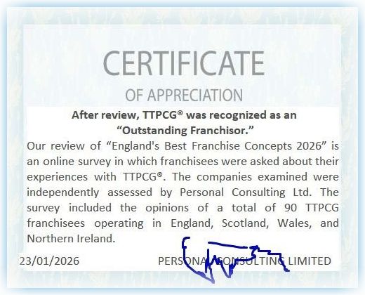 Bei unserer Prüfung „Englands besten Franchise-Konzepten 2026“ handelt es sich um eine Online-Befragung, bei der Franchisenehmer zu ihren Erfahrungen mit TTPCG® befragt wurden. Die Prüfung der untersuchten Unternehmen erfolgte unabhängig durch Recherchen von Personal Consulting Ltd. sowie des Wirtschaftswissenschaftlers Herrn Dr. Thomas Komarek. In die Befragung gingen Urteile von insgesamt 90 befragten TTPCG-Franchisenehmern, die in England, Schottland, Wales und Nordirland tätig sind. Branchenübergreifend wurde aus 23 Unternehmen die TOP 1 ermittelt. Kein weiteres Franchiseunternehmen konnte eine derart positive Bewertung durch seine Franchisenehmer erreichen wie TTPCG®. Aufgrund der hervorragenden Noten, die das Unternehmen TTPCG® von seinen Franchisenehmern erhielt, wurde TTPCG® von uns als „Herausragender Franchisegeber“ ausgezeichnet.