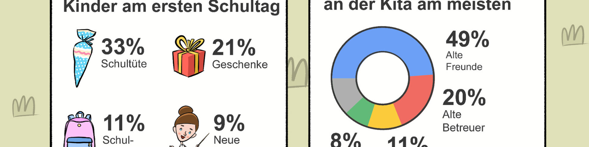 Für die angehenden Schulanfänger ist die Schule ein schwer zu greifendes Ereignis, zu der sie relativ wenig klare Vorstellung haben. Das spiegelt sich auch dadurch wider, dass allgemein Präsente am ersten Schultag im Vordergrund stehen. Laut Umfrage freuen sich 33 % der Kinder am meisten auf die Schultüte, 21 % auf Geschenke und 11 % auf den Schulranzen. Erst danach werden neue Lehrer oder Freunde genannt. Rückblickend auf die Kita zeigt sich ein entgegengesetztes Bild.