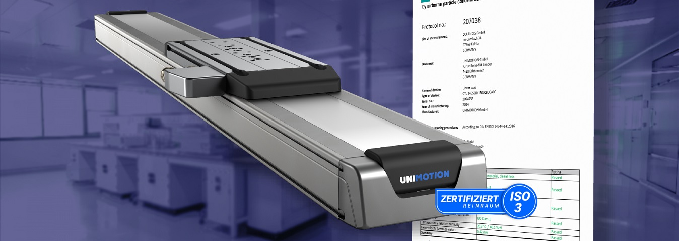 UNIMOTION, führendes Unternehmen im Bereich der Linear- und Antriebstechnik gibt bekannt, dass seine CTL-Lineareinheiten die Reinraumzertifizierungen ISO 3 und ISO 5 erhalten haben. Diese Zertifizierung bestätigt, dass die CTL-Lineareinheiten die strengen Standards in Reinräumen bis zur ISO 3 Klasse erfüllen und somit bestens für Applikationen, die unter kontrollierten Reinraumumgebungen betrieben werden, geeignet sind.