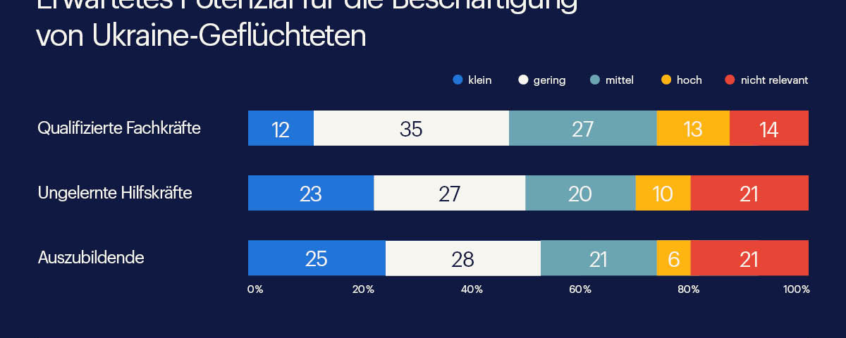 Wenn es um die Beschäftigungsfähigkeit der Ukraine-Geflüchteten geht, haben qualifizierte Fachkräfte die besten Chancen. 40% der befragten Personaler sehen bei dieser Gruppe ein mittleres bis hohes Potenzial. Ein geringes Potenzial bescheinigen ihnen 35%. Die Chancen von ungelernten Hilfskräften stufen insgesamt 30% zwischen mittel und hoch ein, bei Auszubildenden 27%.
