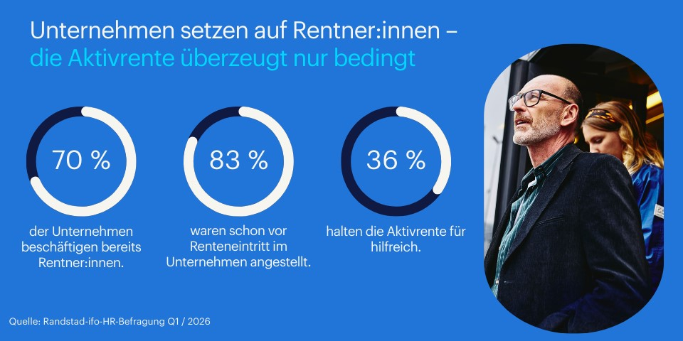 Eschborn, März 2026 – Die Aktivrente soll laut Bundesregierung einen wirksamen Anreiz für Erwerbstätige bieten, länger im Berufsleben zu bleiben. Die Randstad-ifo-HR-Befragung für das 1. Quartal 2026 zeigt: Ältere Beschäftigte und Mitarbeitende in Rente sind auch unabhängig von dieser neuen Maßnahme in vielen Unternehmen längst fester Bestandteil der Personalplanung.
