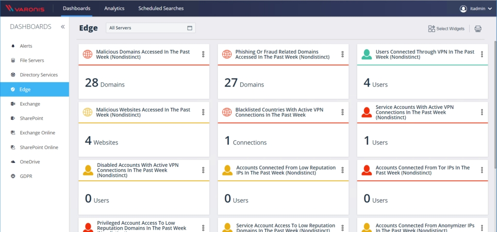 Dashboard für unübliche VPN-, DNS- und Web-Nutzung: Sicherheitsverantwortliche erhalten in Echtzeit Informationen über die größten Risiken bei der Arbeit an entfernten Standorten, wie z. B. Länder auf schwarzen Listen mit aktiven VPN-Verbindungen oder privilegierte Konten, die auf verdächtige Websites zugreifen, und können auf diese Weise schnell und einfach weitere Untersuchungen einleiten.