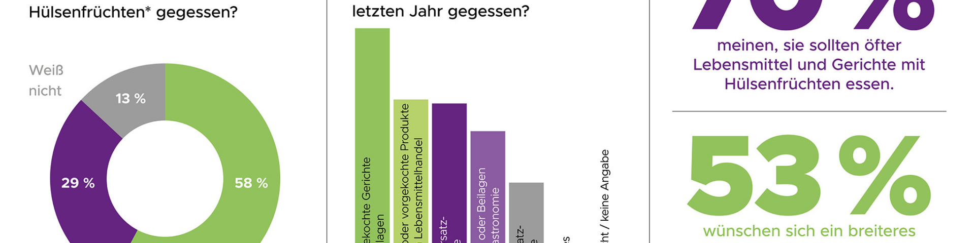 Der Konsum von Hülsenfrüchten nimmt dabei zu: Über 58 Prozent der Befragten gaben an, im vergangenen Jahr Produkte oder Gerichte mit Hülsenfrüchten gegessen zu haben. 61 Prozent finden Hülsenfrüchte grundsätzlich gut, 70 Prozent sind der Meinung, dass sie öfter Lebensmittel und Gerichte mit Hülsenfrüchten essen sollten. Das zeigt, dass die Akzeptanz groß ist, das Sortiment im Handel bislang jedoch nicht im gleichen Tempo wächst.