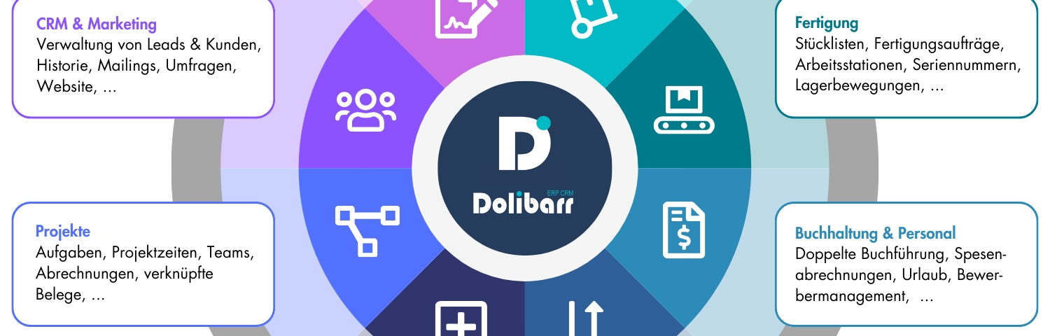Dolibarr ist eine führende Open-Source-Unternehmenssoftware mit einer breiten Palette von Funktionen, einschließlich Auftragsabwicklung, CRM, Warenwirtschaft, Fertigungsunterstützung, Projektmanagement und vielem mehr. Die Software unterliegt vollständig der GPL v3 und ist dauerhaft und uneingeschränkt ohne Lizenzkosten verfügbar.