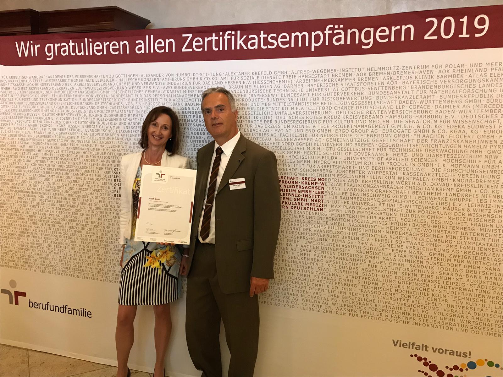 GISA hat am 25. Juni 2019 in Berlin aus den Händen von Bundesfamilienministerin Dr. Franziska Giffey und Oliver Schmitz, Geschäftsführer der berufundfamilie Service GmbH, das Zertifikat zum audit berufundfamilie erhalten. Das Unternehmen hatte zuvor erfolgreich das Dialogverfahren zum audit durchlaufen, das Arbeitgebern offen steht, die seit mindestens neun Jahren mit dem audit eine strategisch angelegte familien- und lebensphasenbewusste Personalpolitik verfolgen. GISA wurde erstmals im Jahr 2009 mit dem Zertifikat zum audit ausgezeichnet, das bislang eine Laufzeit von drei Jahren hatte. Nach drei Re-Auditierungen folgte nun das Dialogverfahren, das mit dem Zertifikat mit dauerhaftem Charakter honoriert wird.