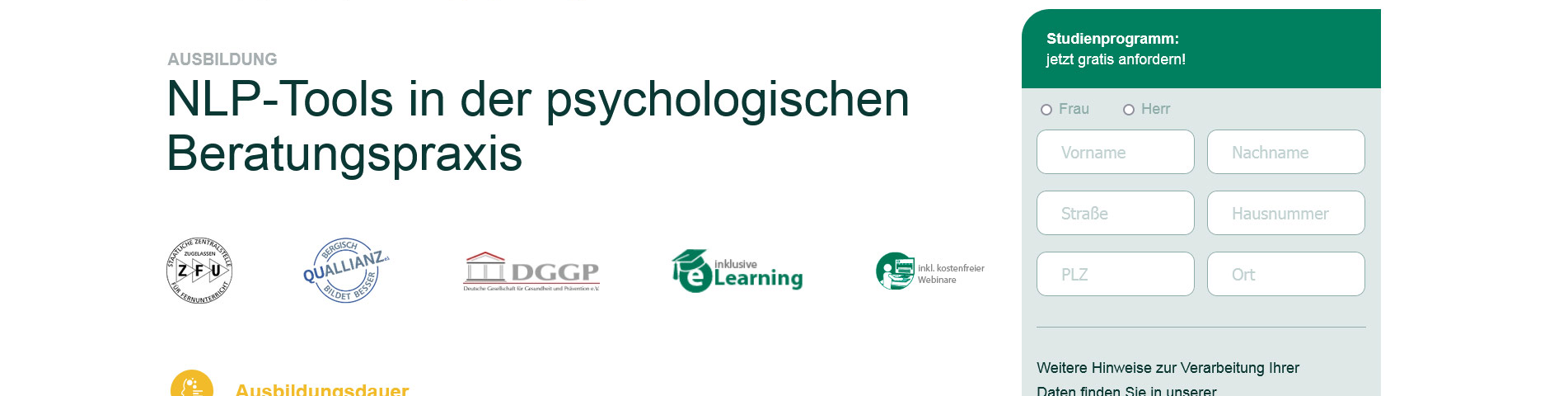 Im Rahmen dieses 12-monatigen Fernlehrgangs lernen die Lehrgangsteilnehmenden bei einem wöchentlichen Lernaufwand von ca. 7,5 Stunden, die Grundsätze einer Zielsetzung, Zielformulierung und Zielerreichung als Voraussetzung für einen erfolgreichen NLP-Veränderungsprozess umzusetzen. Sie erschließen das gesamte Methoden- und Strategiespektrum des neurolinguistischen Programmierens, um im Rahmen des strukturierten Beratungsprozesses Veränderungen bei ihren Klienten professionell begleiten zu können. Dieses Spektrum vereint Erkenntnisse unterschiedlicher psychologischer und anderer geisteswissenschaftlicher Richtungen wie z. B. der Hypnotherapie, der systemischen Familien- und Gestalttherapie sowie der Linguistik und des Konstruktivismus. Unter anderem gezielte sprachliche Interventionen führen dazu, dass neue Betrachtungsweisen möglich, unerwünschte Muster überwunden und neue Denk- und Verhaltensmöglichkeiten erschlossen und etabliert werden.