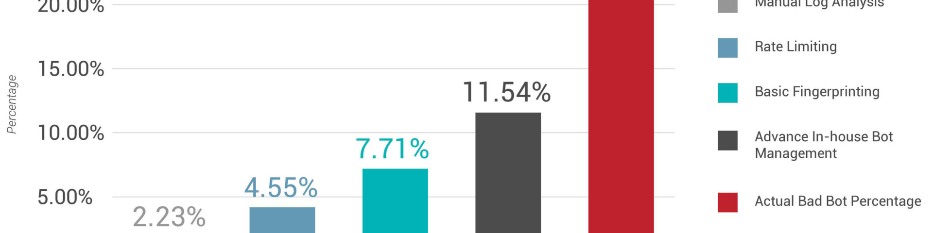 Im Vergleich zu 22,39 % des tatsächlichen Bot-Traffics identifizierten selbst fortschrittliche interne Bot-Management-Lösungen lediglich 11,54 % des Bot-Verkehrs als bösartig. Die Hälfte davon waren zudem falsch-positive Ergebnisse, so dass nur etwa jeder vierte bösartige Bot als solcher erkannt und zudem die gleiche Anzahl arbeitsaufwändiger Fehlalarme generiert wurde.