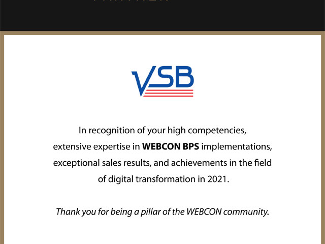 VSB wurde das dritte Jahr in Folge mit der Auszeichnung WEBCON Premium Partner geehrt. Damit hat VSB diesen herausragenden Status inne, seit es diese Auszeichnung gibt. Erneut ist VSB der einzige WEBCON Premium Partner in Deutschland. Das bestätigt den eingeschlagenen Kurs, gemeinsam mit WEBCON die digitale Transformation der mittelständischen Kunden von VSB zu unterstützen.