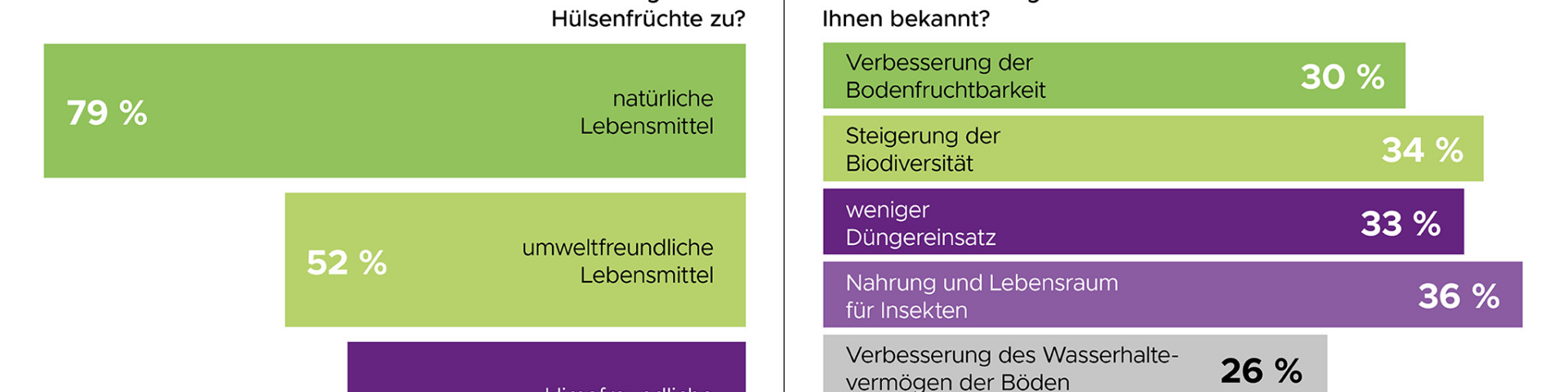Die Befragung zeigt, dass nur ein Teil der Bevölkerung die ökologischen Vorteile des Anbaus kennt. So wissen 30 Prozent der Befragten, dass Körnerleguminosen die Bodenfruchtbarkeit verbessern. 34 Prozent ist ihr Beitrag zur Steigerung der Biodiversität bekannt. 33 Prozent haben vom geringeren Bedarf an mineralischem Dünger gehört und 36 Prozent davon, dass die Kulturen Insekten Nahrung und Lebensraum bieten. Weitere Vorteile wie eine Verbesserung des Wasserhaltevermögens oder des Humusaufbaus sind jeweils sogar nur rund einem Viertel der Befragten bekannt.