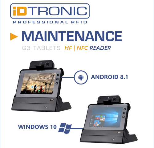 Die Wartung und Instandhaltung ist ein wichtiger Prozess innerhalb von Produktionen in Industrie 4.0. Die Analyse von vergangenen Daten ist für eine richtige Prüfung und Messung wichtig. Unsere G3 RFID Tablets sind eine optimale Tablet Computer Lösung für die Wartung und Instandhaltung von Maschinen und Geräten. Der integrierte RFID HF NFC Leser liest eingespeicherte wichtige Daten auf den RFID Tags valide aus. Wir bieten für Windows und Android Nutzer eine Tablet Computer Lösung an.