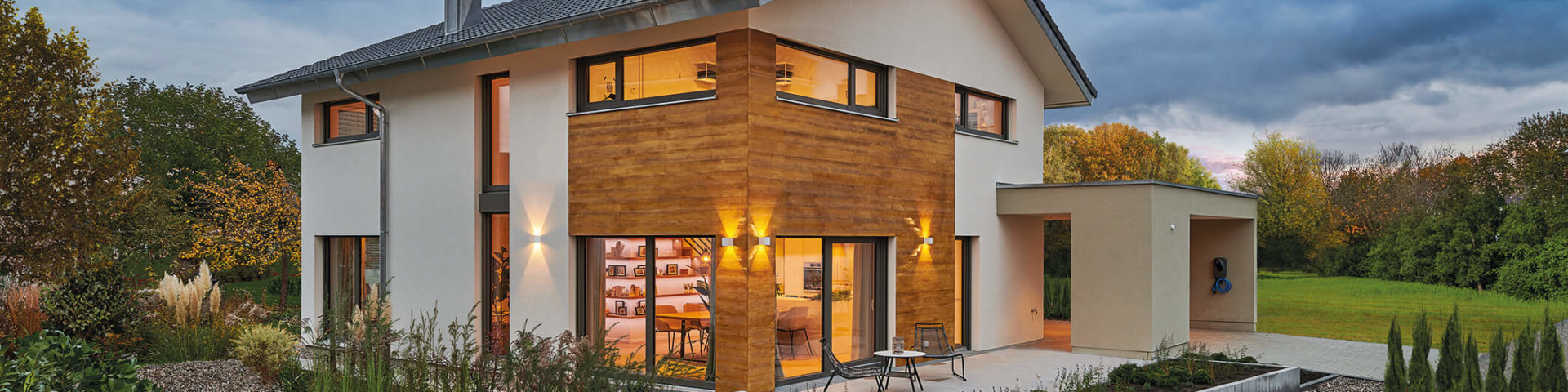 Wie bei allen Häusern von Fertighaus WEISS, wurde auch beim Musterhaus Balance Wert auf energieeffiziente, zukunftsfeste Haustechnik gelegt. Ein Integralsystem vereint die Funktionen Heizen, Warmwasserversorgung, Lüftung mit Wärmerückgewinnung sowie eine Kühlfunktion. Einer nachhaltigeren Lebensweise kommt das Konzept zur Gewinnung, Speicherung und Nutzung von Energie entgegen: Die Photovoltaikanlage erzeugt aus Sonnenlicht elektrischen Strom, der direkt verwendet oder in einem Sonnen-Batteriespeicher zwischengespeichert wird. Am Carport wurde eine Wallbox installiert, die es erlaubt, mit dem selbst erzeugten Strom das Elektroauto aufzuladen. Dank der energiesparenden Bauweise und Haustechnik ist das Musterhaus Balance bereit für die Zukunft und kann nach dem Effizienzhausstandard KfW-40 Plus gefördert werden.