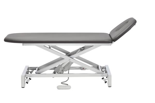 Die Liegefläche dieser Therapieliege ist nicht geteilt. Nur das Kopfteil lässt sich anpassen. Die Liege hat einen elektrischen Antrieb und kann von 48 bis 97 Zentimeter in der Höhe verstellt werden. So gelangen auch stark motorisch eingeschränkte Patienten gut auf die Therapieliege.