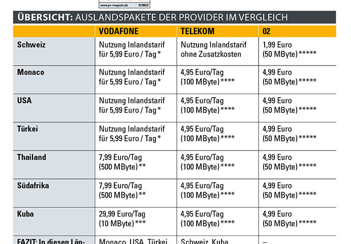 München, 3. August 2022. In seinem Tarifcheck hat das PC Magazin die Konditionen der drei großen Provider Telekom, Vodafone und O2 für das Surfen im Ausland verglichen. Im Mittelpunkt des Vergleichs stehen die Kosten für Reisende während eines Auslandsaufenthalts. Diese wurden exemplarisch in sieben Ländern ermittelt: Kuba, Monaco, Schweiz, Südafrika, Thailand, Türkei und USA.