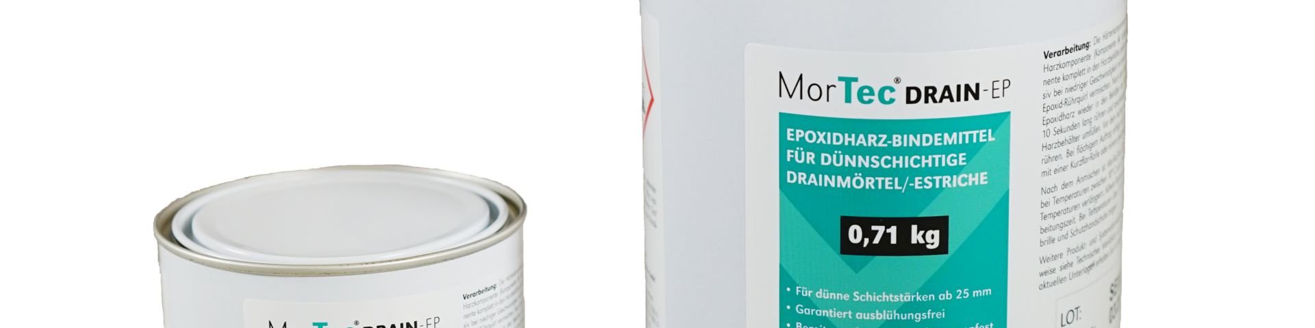 Durch die Umstellung von einem 2-kg- auf ein 1-kg-Gebinde können Verarbeiter die Menge des Drainmörtels jetzt zusätzlich besser dosieren: Je 25-kg-Sack Drainkorn wird 1 kg Bindemittel eingesetzt, das in einer Kombidose verpackt ist – die Härterkomponente wird einfach mit der Harzkomponente vermischt, dann das Ganze mit dem Drainkorn.