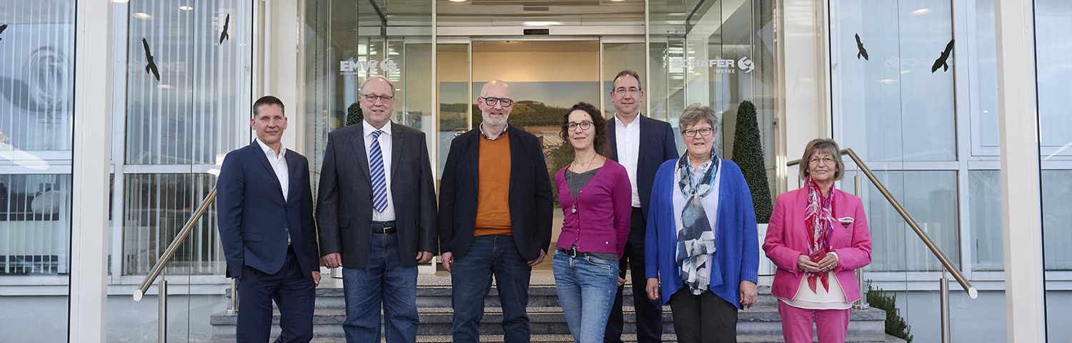Bildunterschrift: Beim Besuch von vier der fünf unterstützten Organisationen am Firmensitz der SCHÄFER WERKE Gruppe in Neunkirchen, von rechts nach links: Beate Schäfer-Henrichs (Gesellschafterin SCHÄFER WERKE Gruppe), Ruth Ebener (Alpha-Omega e.V.), Michael Mockenhaupt (Geschäftsführer SCHÄFER WERKE Gruppe), Rebecca Kranz (Kinder- und Jugendhospiz Balthasar), Stefan Sauer (Tafel Neunkirchen), Thomas Weiß (Ev. Hospiz Siegerland), Guido Klinkhammer (Geschäftsführer SCHÄFER WERKE Gruppe).