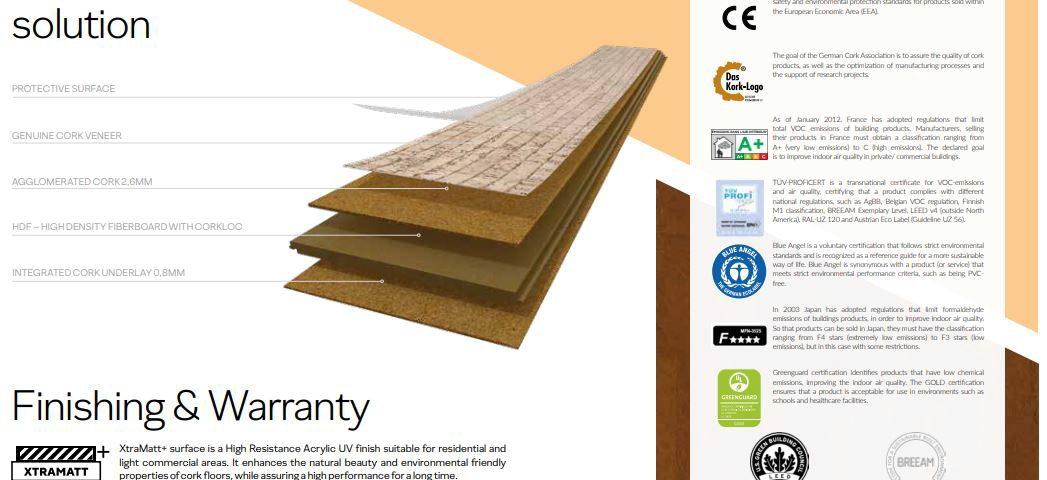 Schönheit eines Kork-Bodenbelages sowie die umweltfreundlichen Eigenschaften und gewährleistet gleichzeitig eine