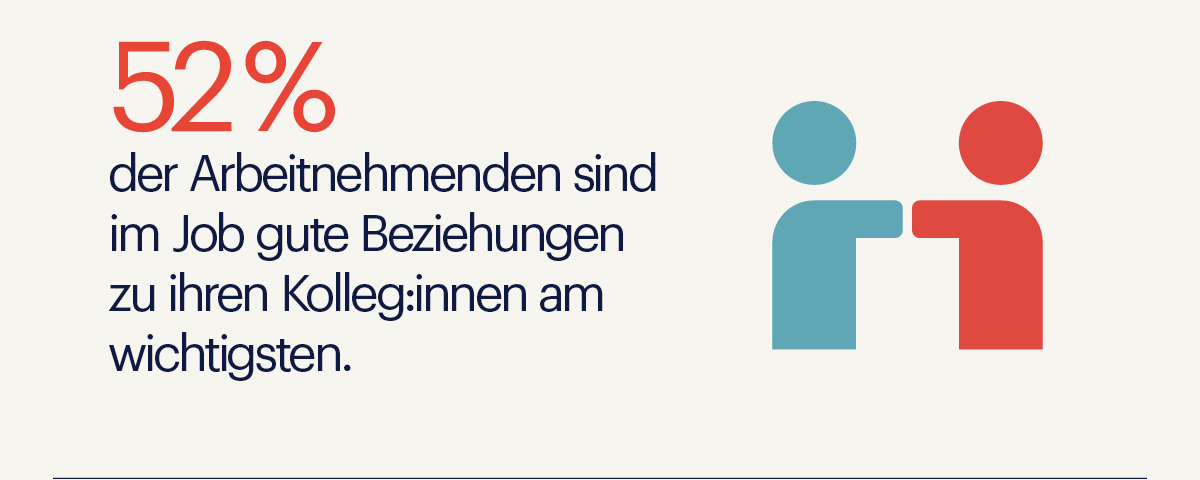 Für 52% der deutschen Arbeitnehmenden ist eine positive Beziehung zu ihren Kolleg:innen sehr wichtig. Damit liegen zwischenmenschliche Beziehungen noch vor flexiblen Arbeitsmöglichkeiten (42,6%) oder einem attraktiven Standort (37,1%). Ein gutes Verhältnis zu Vorgesetzten ist für 34,1% der Befragten ebenfalls von großer Bedeutung. Die Umfrage zeigt auch, dass ein moderner Arbeitsplatz keine so große Rolle spielt: nur 26,8% der Befragten ist dieser Aspekt wichtig.