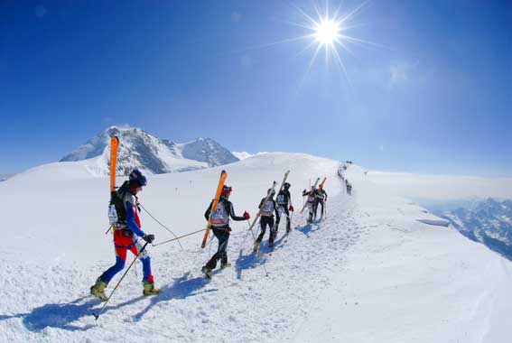 Den Abschluss der großen Wettkämpfe bildet ein ganz besonderes Skitouren-Rennen, die Trofeo Mezzalama am 27. April. Das höchste alpine Rennen dieser Sportart weltweit beginnt in Cervinia und endet mit einer Abfahrt vom Lyskamm nach Gressoney-la-Trinité. Wie herausfordernd die Strecke für die Dreier-Teams ist, zeigen schon die Zahlen: Auf 45 km geht es mehrfach über die 4000er-Marke. Allein 2.862 Höhenmeter sind im Anstieg zu bewältigen und 3.145 in der Abfahrt. Dieser einzigartige Wettkampf blickt auf eine lange Tradition seit 1933 zurück und bringt alle Jahre wieder begeisterte Extremsportler ans Monte-Rosa-Massiv.