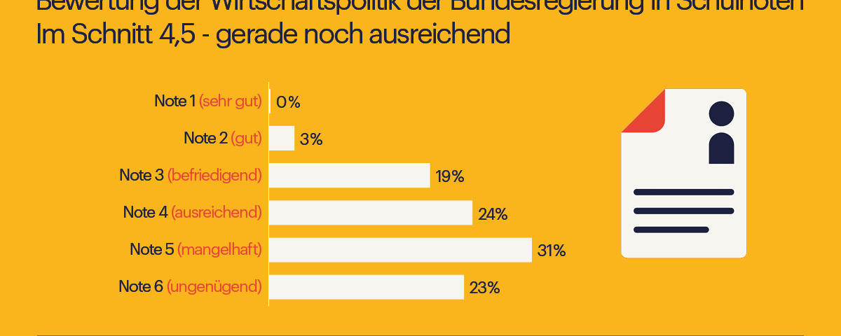 Wenn die Ampel-Regierung im Jahresfeedbackgespräch mit deutschen Personalern säße, wäre das ein intensiver Austausch: Eine Mehrheit von ihnen stellt der regierenden Koalition ein mangelhaftes Zeugnis aus. Der Notendurchschnitt für die deutsche Wirtschaftspolitik läge bei 4,5 – also gerade noch „ausreichend“. Handlungsbedarf sehen die befragten Personaler vor allem beim Abbau von Bürokratie und der Vereinfachung von Geschäftsprozessen und Genehmigungsverfahren.